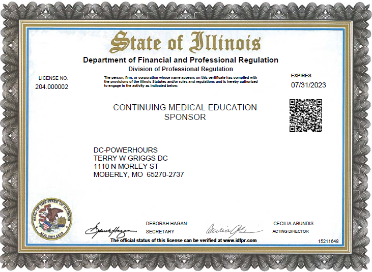 AS A CONTINUING MEDICAL EDUCATION SPONSOR LICENSED BY THE ILLINOIS DEPARTMENT OF FINANCIAL AND PROFESSIONAL REGULATION, ALL CLASSES ARE APPROVED FOR CATEGORY 1 OR “FORMAL” CREDIT HOURS.